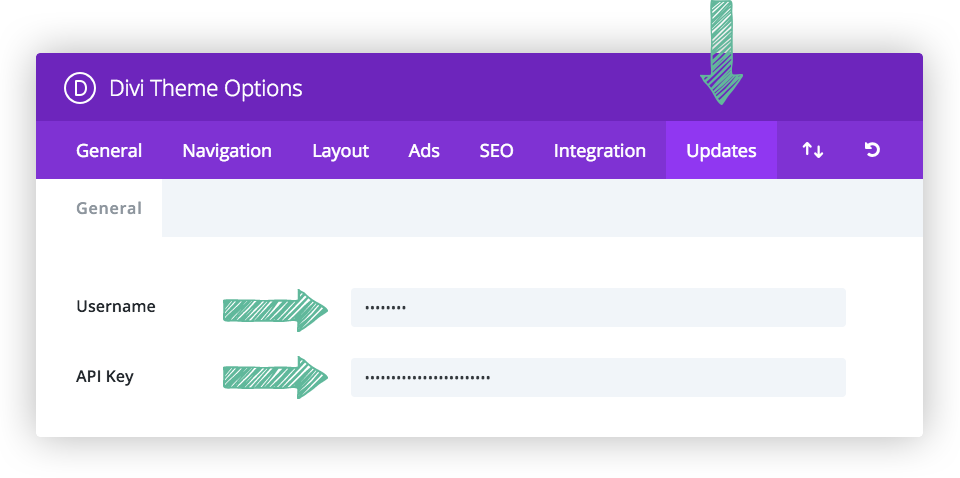 Antes de poder actualizar, primero debes activar la ingresando el nombre de usuario y clave de API en «la pestaña Actualizaciones» de tu tema o configuración del plugin. Solo los miembros con cuentas activas de Elegant Themes tienen acceso a las últimas versiones de nuestros productos. Tu nombre de usuario es el nombre de usuario que se utiliza cuando se inicia sesión en ElegantThemes.com, y la clave de API se puede encontrar iniciando sesión en Elegant Themes y haciendo clic en el enlace Cuenta > Clave de API. Si compraste la licencia a un tercero este debe darte el nombre de usuario y la API Key.